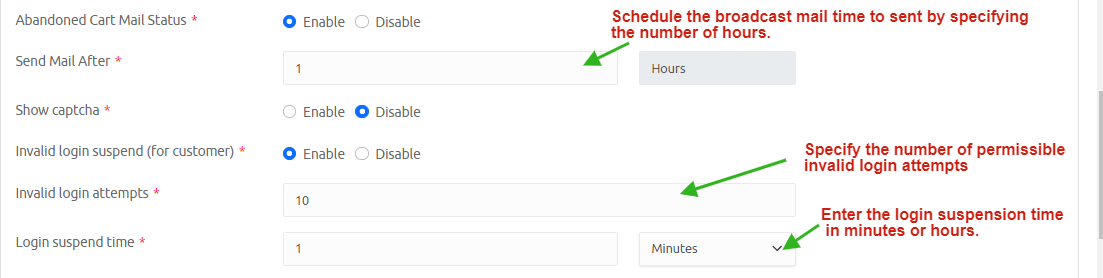 Abandoned cart emails assist in recovering lost orders by reminding the abandoned cart shoppers to complete their purchase operation. Select Abandoned cart mail status enable/disable based on your preference in processing the customer emails.