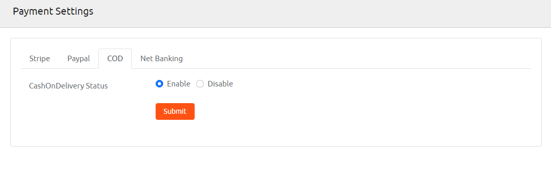 If you wish to offer the cash on the delivery choose enable or disable option by selecting the radio button and click the submit button.