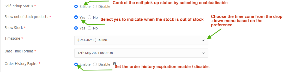 If you want to eliminate the waiting time of your customers, you can enable/disable self-pickup status, and you can also control the display of out-of-stock products and stock products by selecting the yes/no radio button.