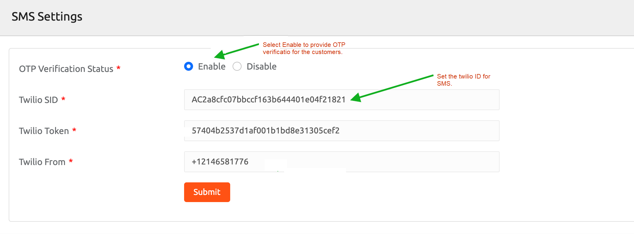 Twilio from - The Twilio phone number that transmits a message to the customer starts with a format plus followed by country code and click the submit button.