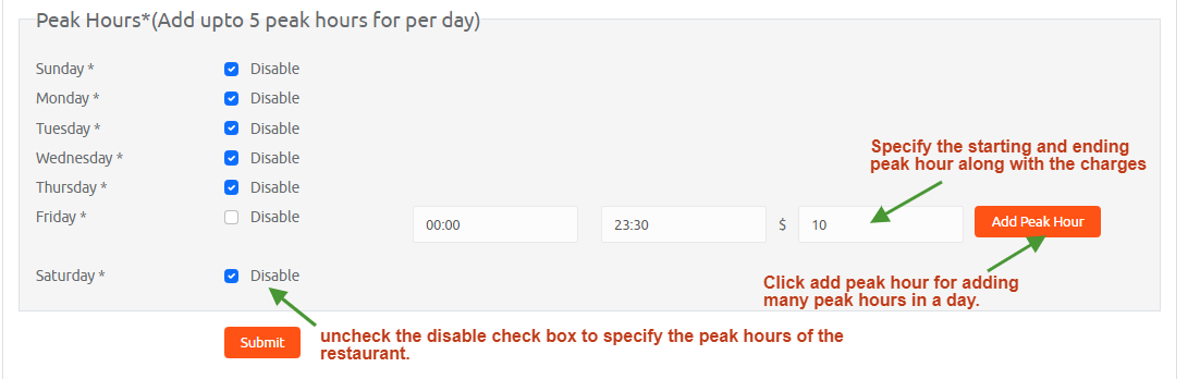Add extra peak hours to your restaurant for every hour by clicking the add peak hour button. It leads to the creation of additional rows containing the start and end times for the new entry.