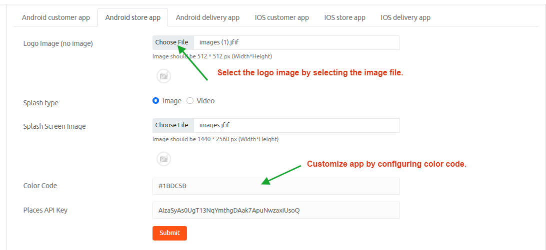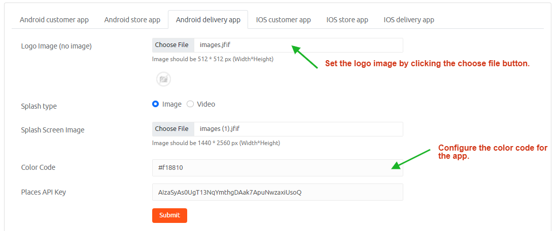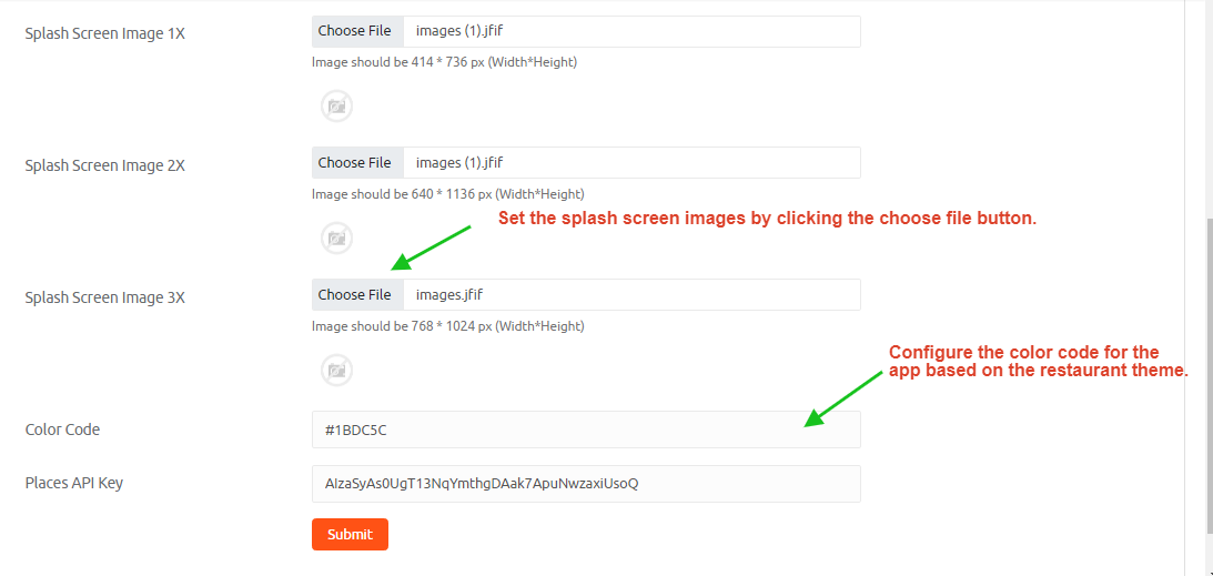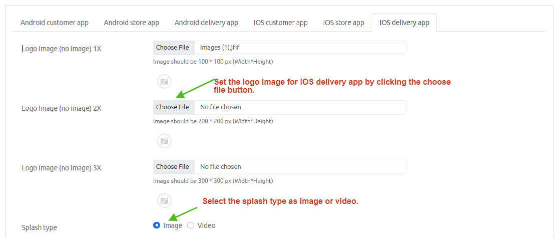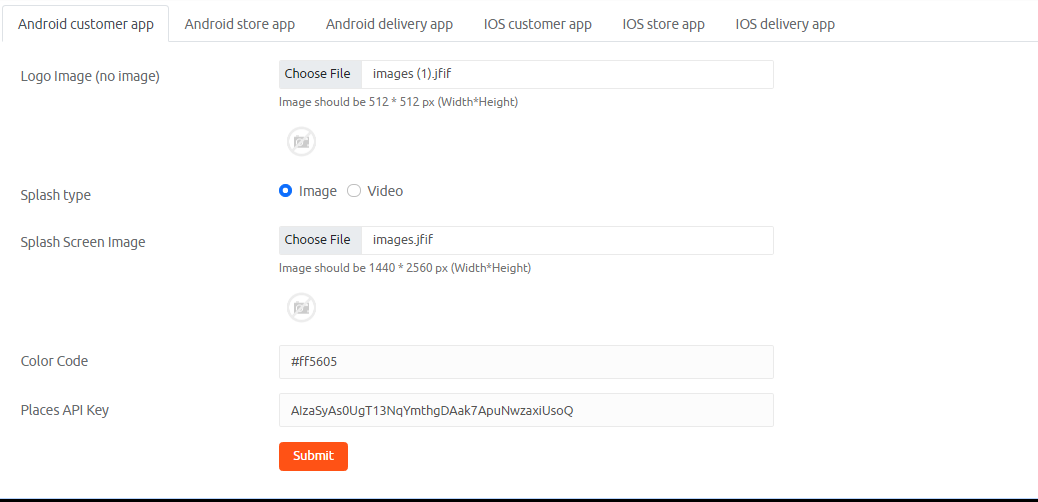 Splash Screen Image - Click the choose file button to upload the image with the allowed width and height as 1440 * 2560 px.