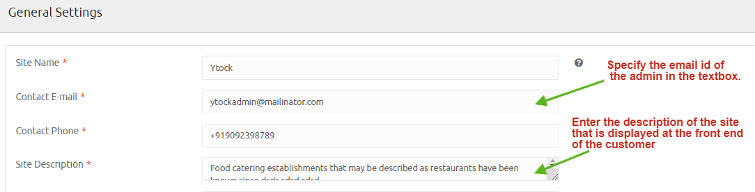 Specify the admin email id in the contact email text box and your restaurant contact number in the contact phone textbox.