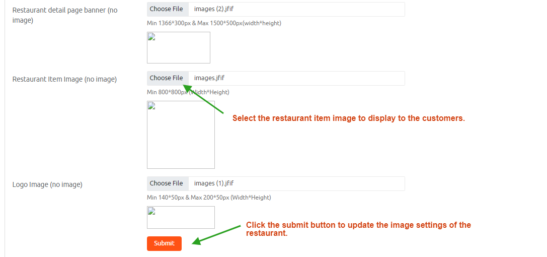 Home Logo It serves as branding for your restaurant and helps the customer to find out your restaurant effortlessly. Upload your restaurant logo under the allowed height between 140x50px and 200x50px. Click the choose file button, which pops up a dialog box. Select the desired image file to upload the image.