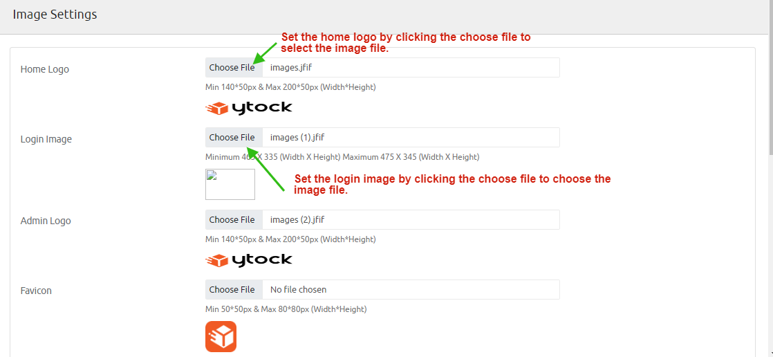 Admin LogoSet the Admin logo with Min 140*50px & Max 200*50px (Width*Height). Click the choose file button that pops up a dialog box, select the desired image to upload the image.