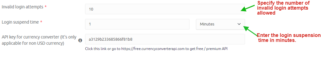 This section shows the total number of invalid login attempts that can be allowed within the textbox, along with the aggregate suspension time in terms of minutes by selecting from the list.