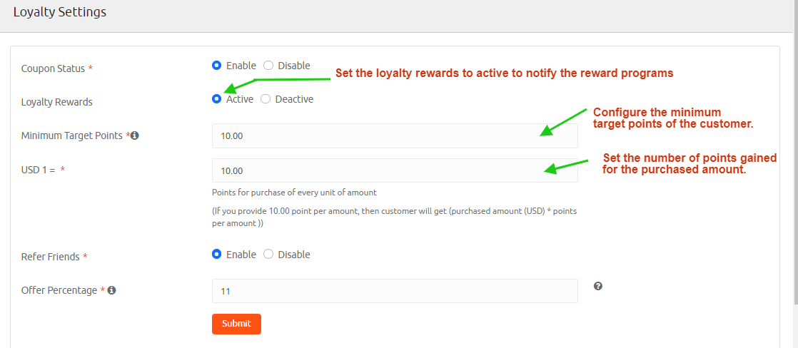 Offer Percentage - When the customer refers a friend, a certain percentage of reward points is credited to the customer account based on the purchase amount made by the friend.