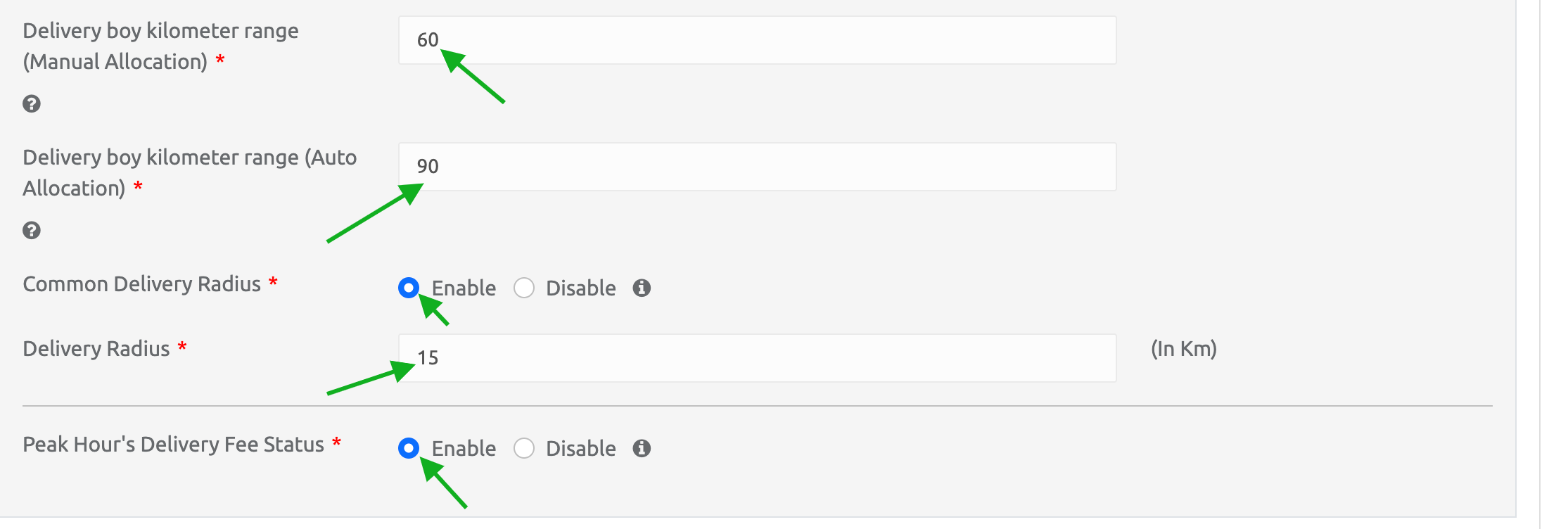 Common delivery radius - Configure the permissible delivery radius by selecting enable or disable by option as per your wish.