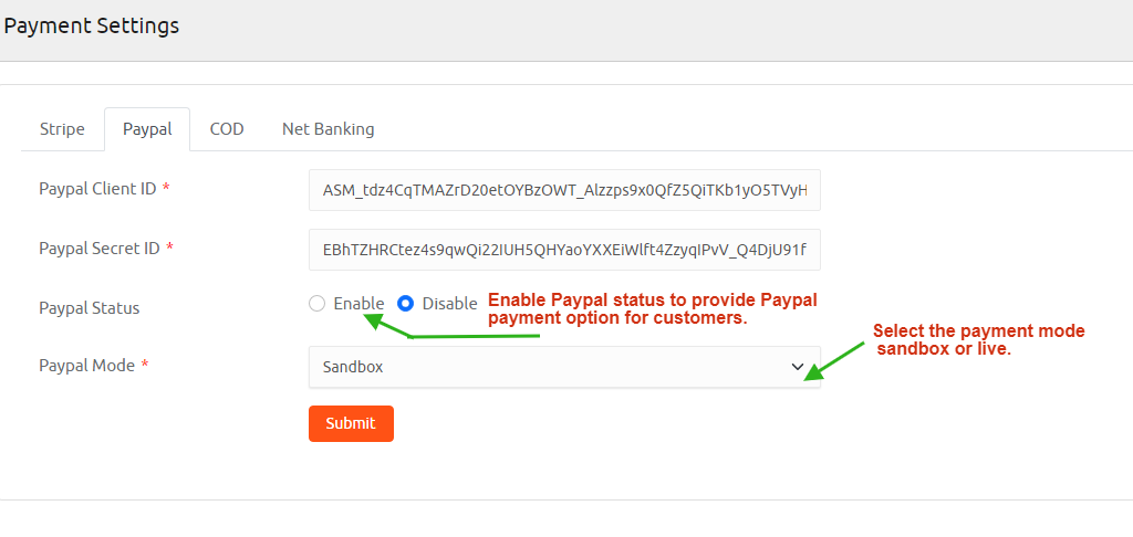 Paypal Mode - Select the Paypal mode either, sandbox or live from, the list.